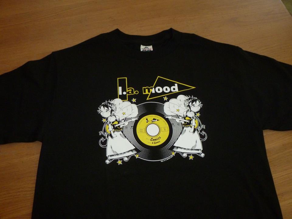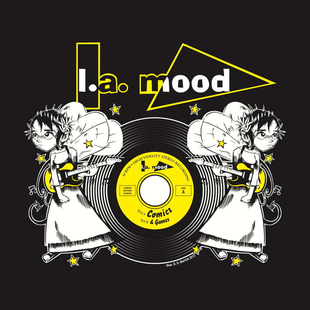 So, here’s the first post to mar the blank, boring perfection of this blog. Back in the fall, I designed t-shirts for L. A. Mood Comics & Games in London, Ontario. They looked like this: