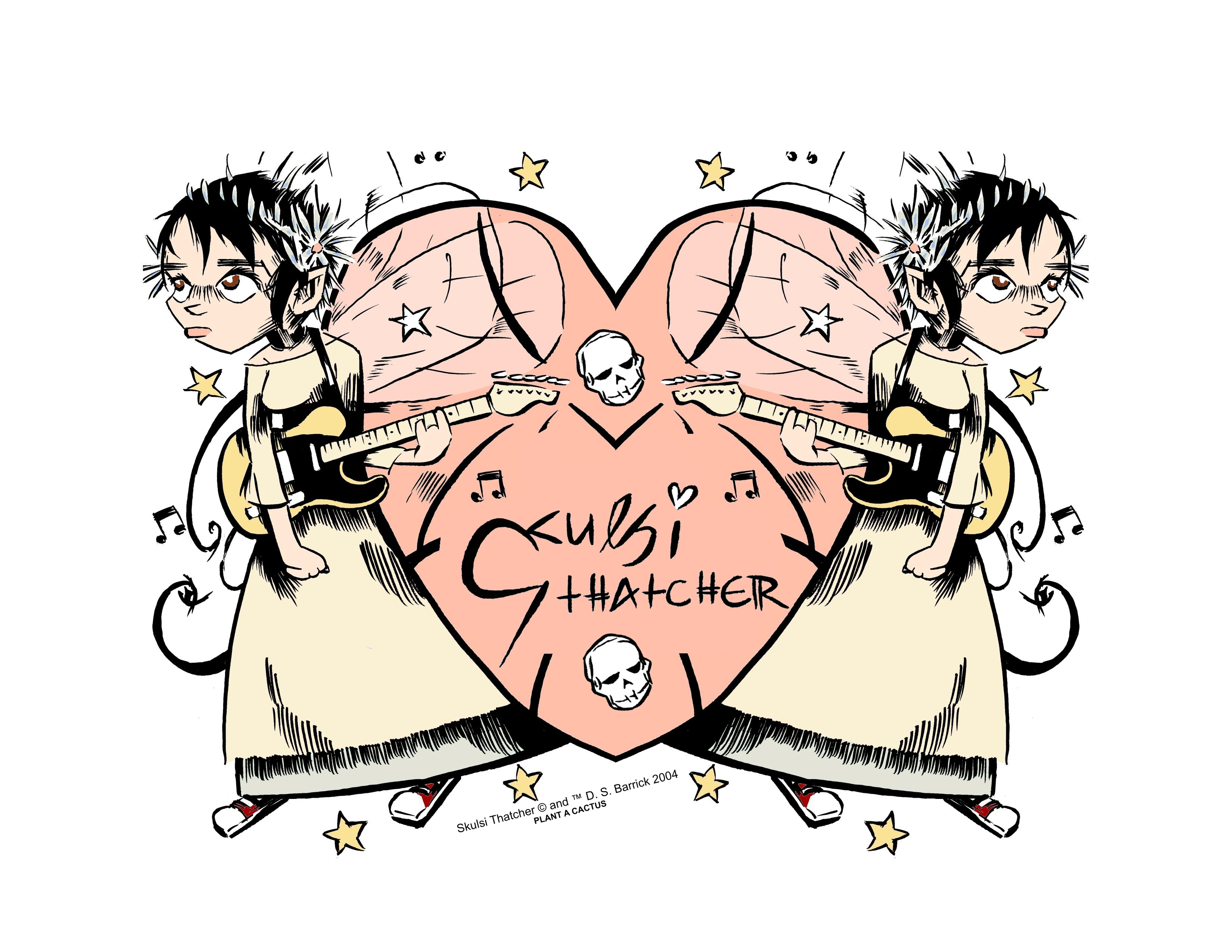 The design was an old one we’d been bouncing around back when I started work on Skulsi Thatcher (probably 2004-ish). It was rendered in hideous pastel colours and featured a lumpy heart shape that was neither graphically pleasing nor anatomically correct. No wonder we didn’t go ahead with it then. The following image does not feature the aforementioned hideous pastel colours – in this draft I opted for boring pastel colours – but you get the idea: