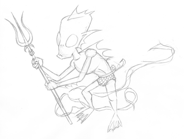This little merfolk chap, or “merman” if you will, is actually the first creature I worked on for the shirt. I think he has a bit of the flavour of some of the Simic merfolk creatures from Magic, with a dash of Abe Sapien from Mike Mignola’s Hellboy, and a sprinkling of the protagonist from Trevor Jamieson’s first mini-comic, Tin.Β He also has a triton, as any merman worth his sea salt should. The most surprising aspect of the design, for me at least, is that I decided I really wanted him to be wearing scaly shorts. Yes, I believe I was heavily influenced by Namor, who, for those of you who don’t know, is the Mighty Marvel answer to Aquaman (I don’t actually know which character came first). All superheroes are better than Aquaman, but the specific reason that Namor trumps Aquaman is that he is pretty much Mr. Spock in a scaly green Speedo. Only Vulcan blood and the practice of Kolinahr can explain how Namor can go about his heroic business, still stoic and focussed, while dressed the way he is.