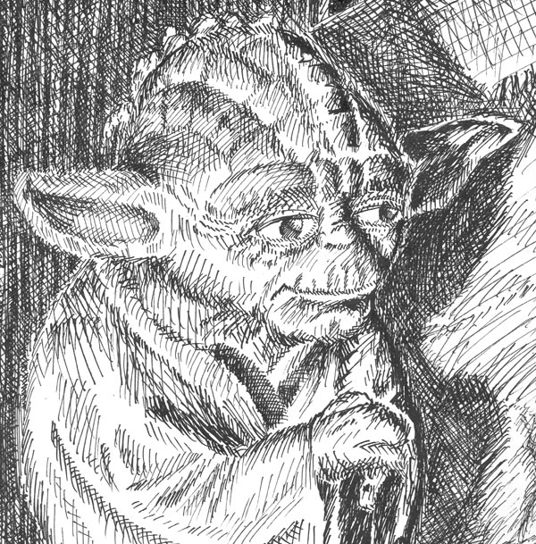 Today marks the thirty-sixth anniversary of the release of Star Wars, on May 25, 1977. I drew this ink-on-paper image of a vinyl Yoda hand-puppet in the fall of 1999; it’s a detail of a larger drawing entitled Still-Life with Nine-Hundred-Year-Old Jedi Master. A shout-out to all my fellow Star Wars fans – the Force will be with you. . . always!