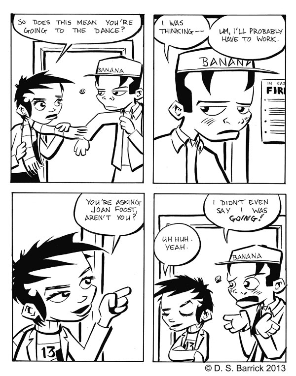 At this point in the strip, I don’t think I had quite figured out the housing situation for Naomi and Charlie. This scene must take place in Charlie’s apartment, as evidenced by the peephole and the fire escape plan visible on the wall. The map of “Naomi Thatcher’s London” printed in the back of Sick Sense of Melody reveals that Charlie and his brother Dave share an apartment on Baker Street (much like Sherlock Holmes and Dr. Watson, save in Canada rather than England – ironic now that I consider that Charlie and Dave’s surname is Watson).